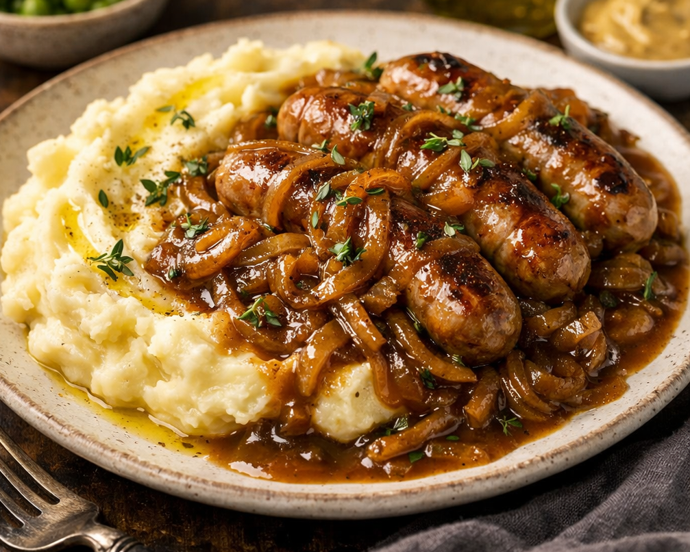 Spoon creamy mash onto plates, top with sausages, and generously ladle onion gravy over everything. Finish with a drizzle of Extra Virgin Olive Oil and a few thyme leaves if desired.