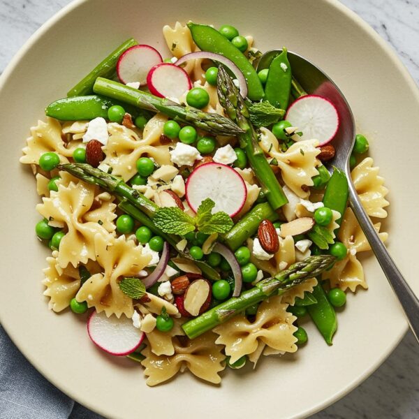 Ingredients: For the Salad: 8 oz farfalle 1 cup snap peas, trimmed and halved 1 cup asparagus, chopped into 1-inch pieces ½ cup radishes, thinly sliced ¼ cup red onion, thinly sliced ½ cup crumbled goat cheese or feta ¼ cup toasted almonds Fresh mint for garnish For the Dressing: 3 tbsp Olive Us Rosemary…